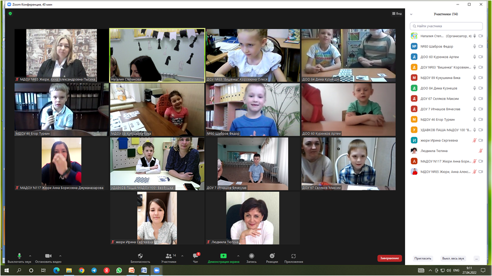 27 апреля 2022 года на 5 площадках (МДОУ № 27 «Антошка», МДОУ № 46 «Золотой петушок» МДОУ № 92 «Ивушка», МДОУ № 99 «Почемучка», МАДОУ № 117 «Капелька») прошел городской шахматный турнир среди детей старшего дошкольного возраста «Белая ладья».