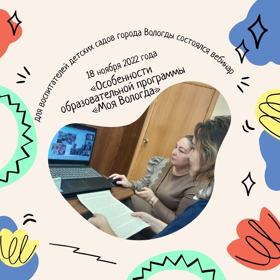 18 ноября 2022 года, для воспитателей детских садов города Вологды состоялся вебинар «Особенности образовательной программы «Моя Вологда». Мероприятие организовано МАУ ДО «Центр творчества» СП «РМЦ» и МДОУ №85 «Подснежник» г. Вологды. Вебинар был организован в дистанционном формате, на который подключились 52 ДОО нашего города.
